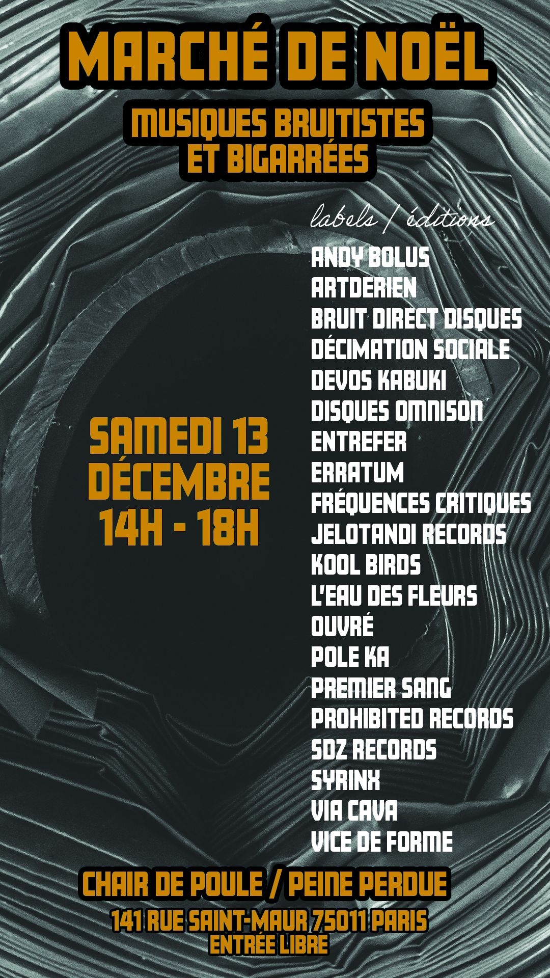 Andy Bolus / Art de rien / Bruit direct disques / Davos Kabuki / Décimation sociale / Disques Omnison / Entrefer / Erratum / Fréquences critiques / Jelotandi Records / Kool Birds / L'Eau des fleurs / Ouvré / MMLI / Pole Ka / Premier sang / Prohibited rec. / SDZ rec. / Syrinx / Via Cava / Vice de forme